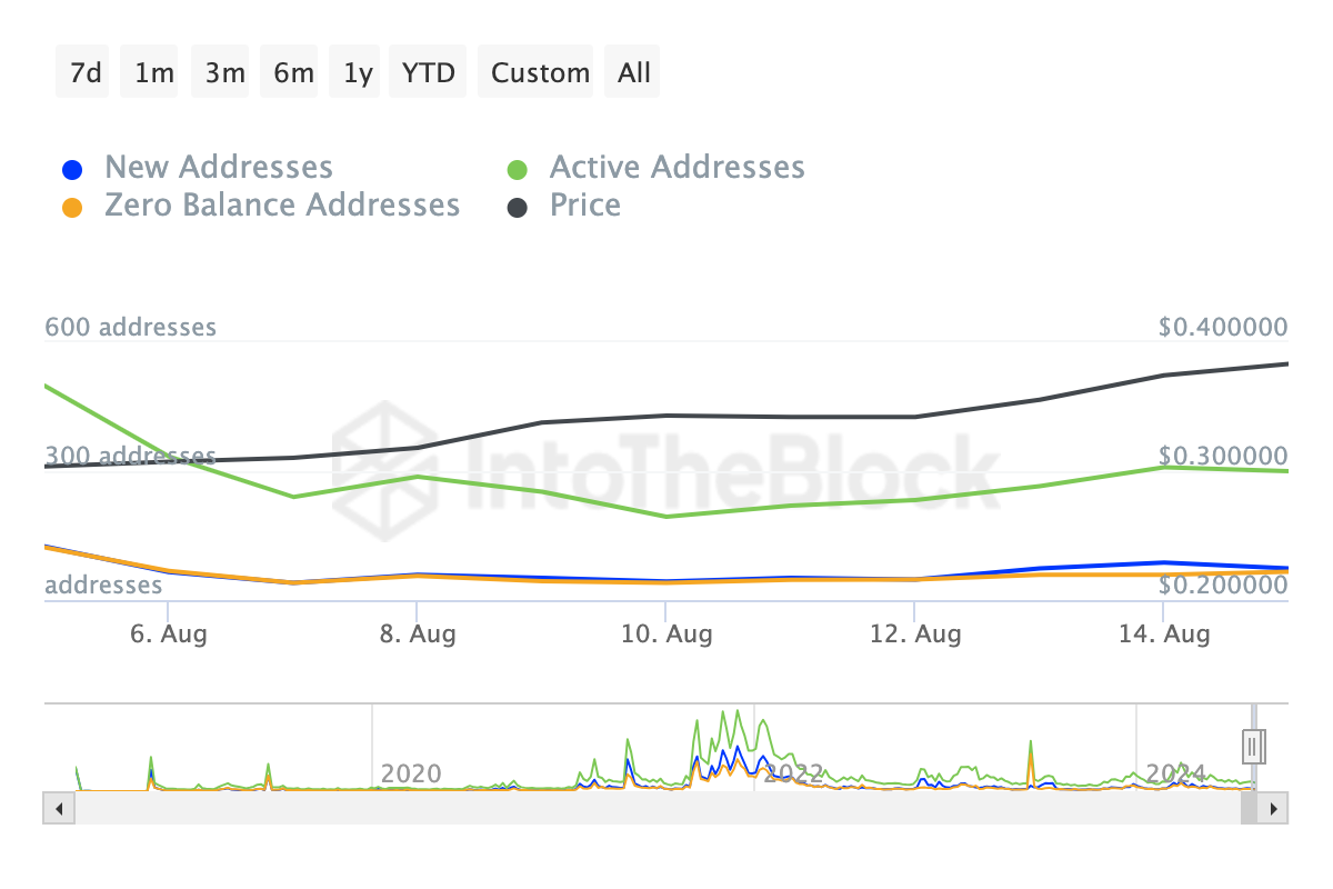 Supporting this outlook are Fantom’s active, new, and zero-balance addresses, which have seen growth over the last seven days, according to IntoTheBlock. This increase indicates rising user engagement on the blockchain, confirming that the price surge isn’t occurring in isolation but is backed by active participation.