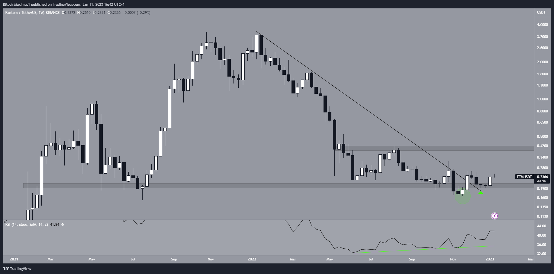 The Fantom price has decreased since its all-time high of $3.48 in Oct. 2021. The drop continued until a minimum price of $0.16 in Nov. 2022. The low was made below the $0.20 horizontal support area, which has been in place since 2021.