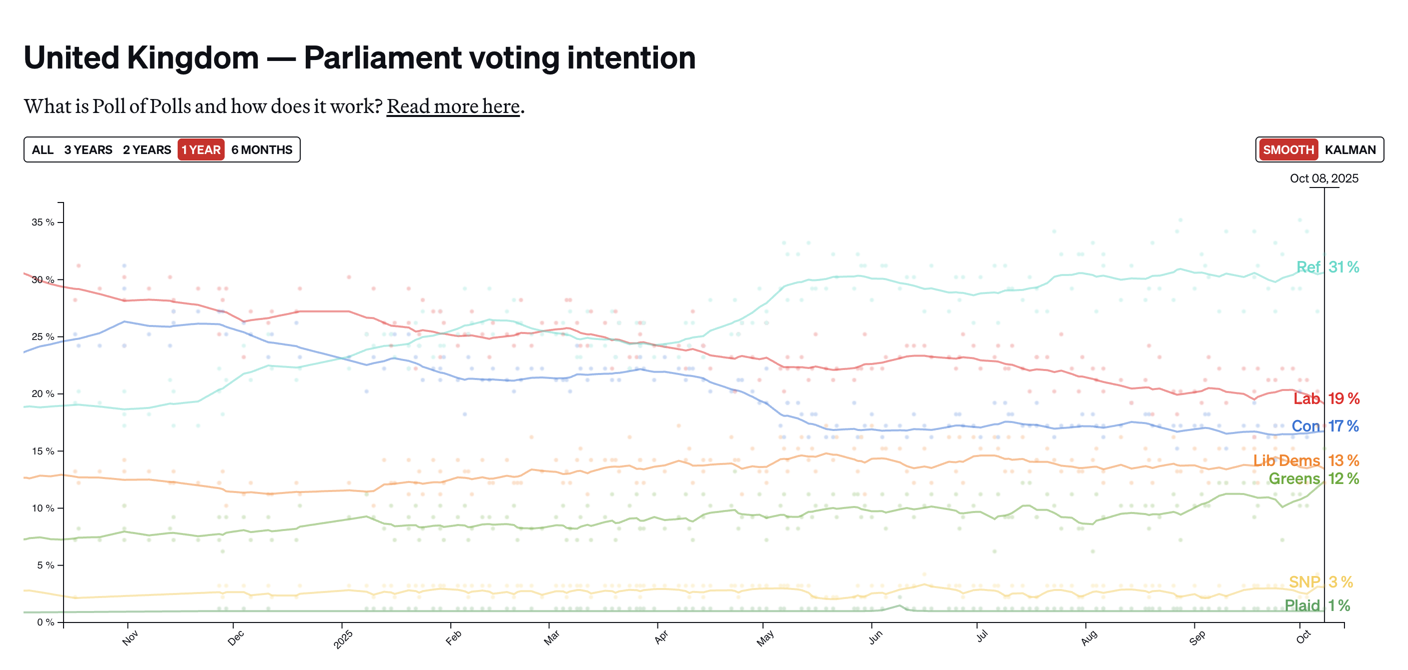 Politico projected Reform UK to win 311 seats — just 15 short of an outright majority — with a 31% vote share in early October 2025. Analysts see this as a collapse of two-party control and a rise in support from voters angry about overregulation and taxes.
