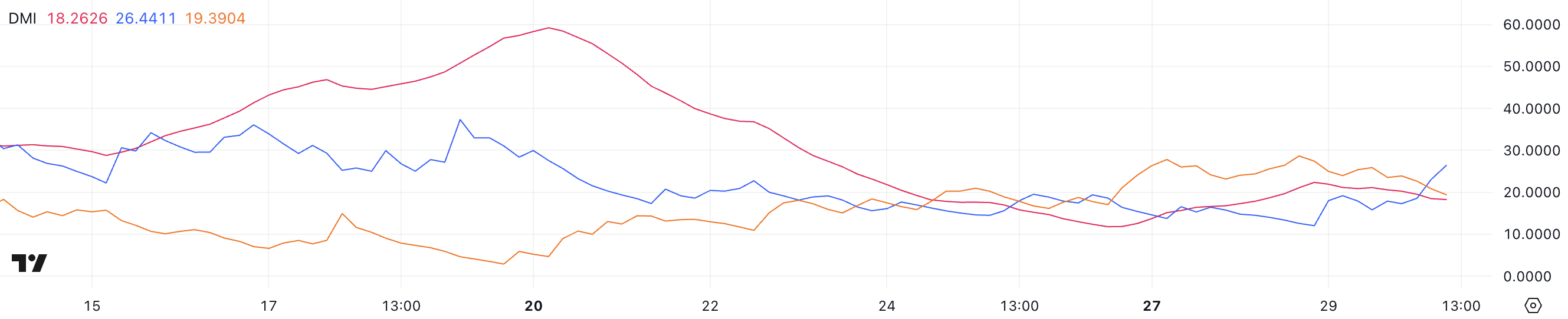 FARTCOIN DMI chart shows its ADX at 18.2, which has remained at that level over the past few days. The ADX (Average Directional Index) measures trend strength, with values below 20 indicating weak momentum, while readings above 25 suggest a stronger trend forming.