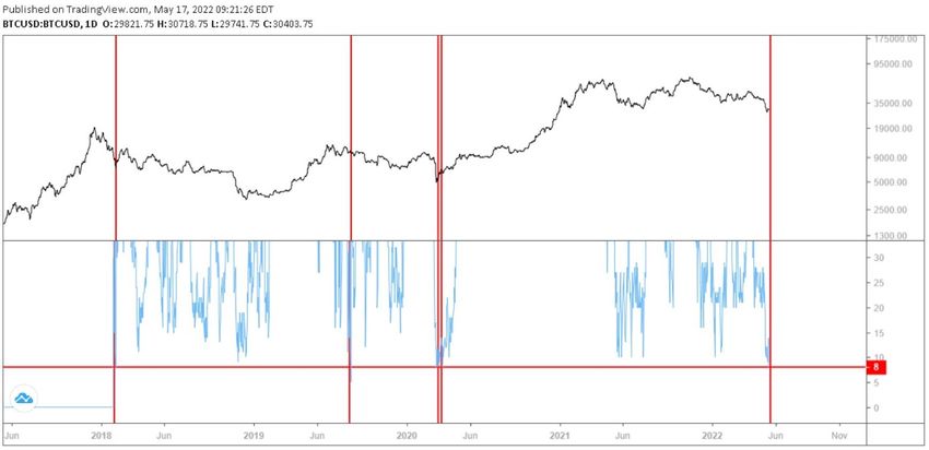 In the entire available history of the index, a value of 8 or lower has only been reached 3 times before (red circles). This happened in February 2018 (BTC bottomed at $6,000), August 2019 (BTC bottomed at $9,320), and March 2020 (BTC bottomed at $3,782).
