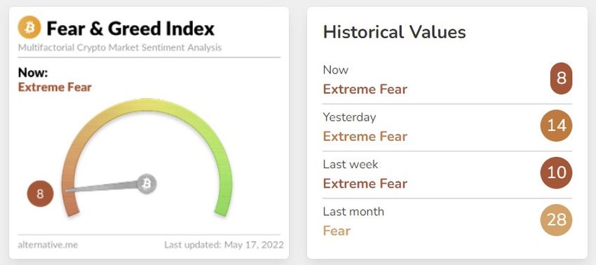 According to data from Alternative.me today’s value of the Fear and Greed Index is 8 on a 0-100 scale. This value comes after about 6 months of declines. During this period, the index has very rarely gone beyond the extreme fear (0-24 range) or fear (25-49) area.