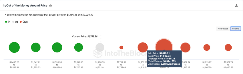 Sponsored SponsoredAccording to IntoTheBlock’s In/Out of The Money Around Price (IOMAP) data, 3.38 million investors that bought 10.97 million ETH at the average price of $1,835 could trigger a pullback.