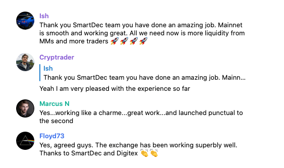 Three days in and the initial group of 20 users has been providing the company with some enthusiastic feedback about the exchange. Digitex selected the group based on their trading experience and long-standing support for the company’s vision. Below is a screenprint from a private Telegram the company has been running for the mainnet users, shared on the company’s blog.Â