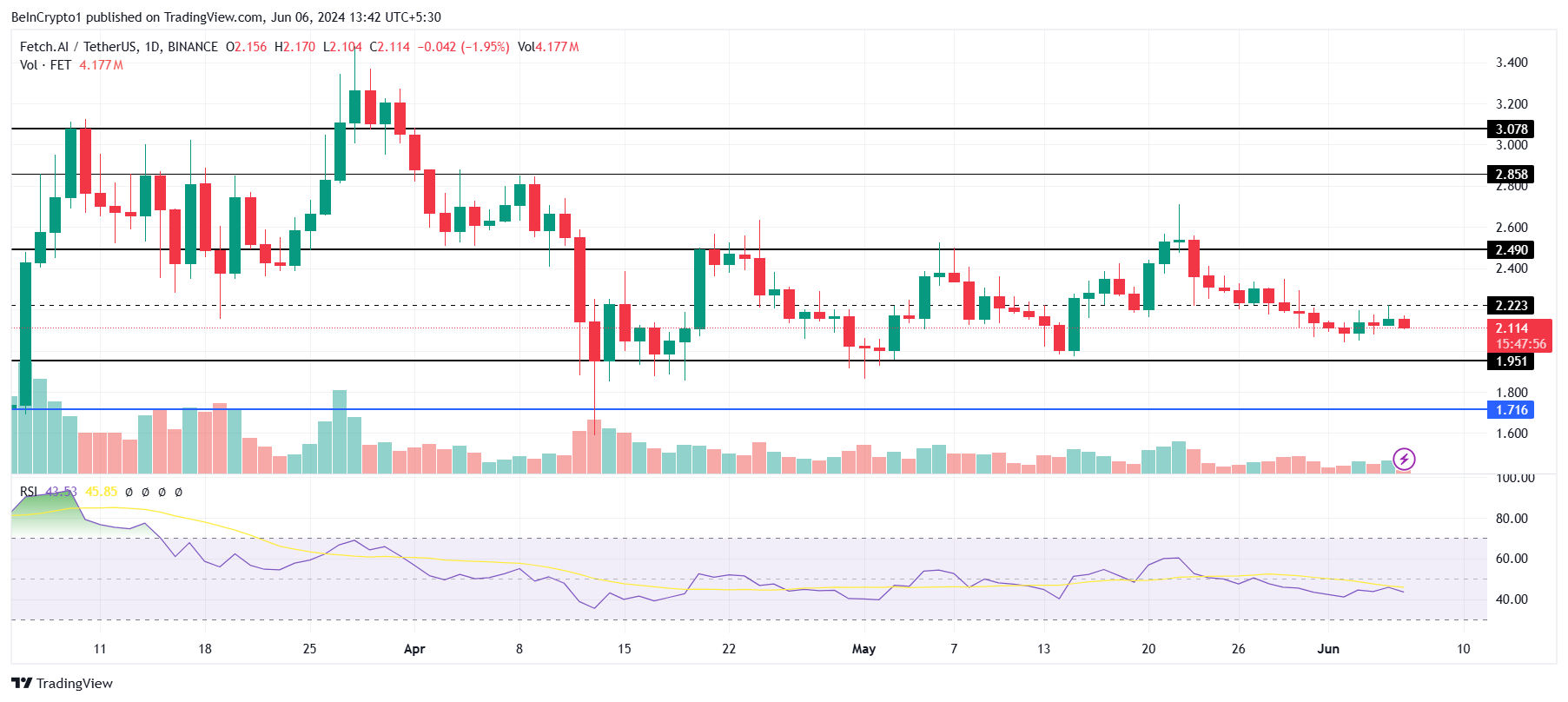 Fetch.ai’s price has been consolidating for the past two months, with every breakout attempt failing so far. FET is changing hands at $2.11, moving within the range of $1.95 and $2.49.