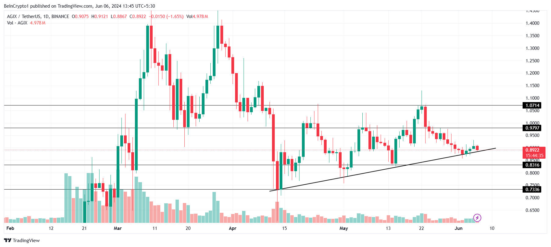 AGIX price has been doing well on the macro time frame. The altcoin has observed a consistent uptrend for the past two months, bringing the trading price to $0.89. AGIX is currently sitting under the critical resistance of $1.00.