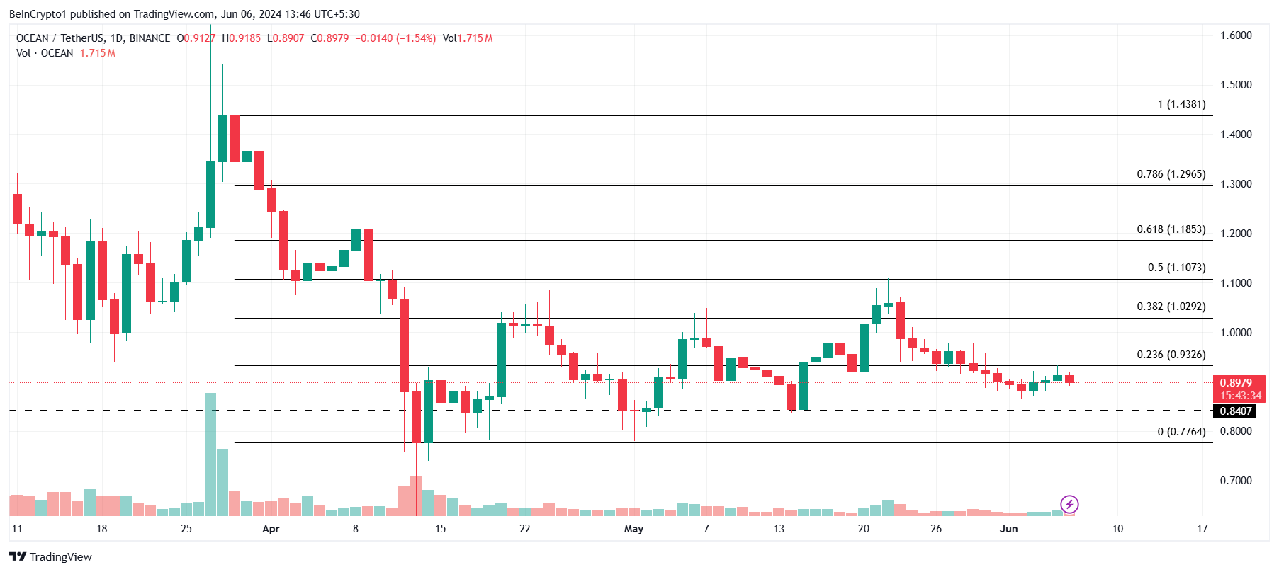 OCEAN’s price action has not been too impressive, either. The altcoin has been consolidating between $0.84 and $1.02 for a solid eight weeks. OCEAN nearly breached the upper limit once but failed to sustain the rise, returning to the trading price of $0.89.