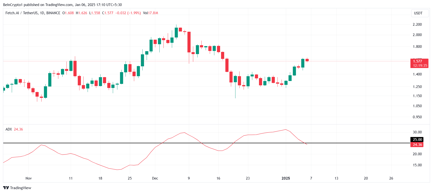 FET’s macro momentum, analyzed through the Average Directional Index (ADX), offers a nuanced picture. The ADX currently lies below the neutral threshold, signaling the prior downtrend has weakened, possibly ending. This development suggests FET may transition into a more stable phase.