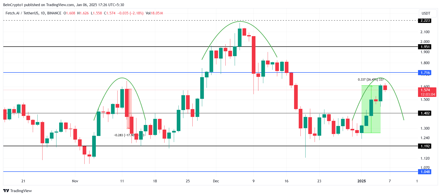FET’s price is teetering on the edge of forming a bearish head-and-shoulders pattern, a warning sign for potential losses. A drop below the $1.19 support level would confirm the pattern, potentially triggering a significant decline.