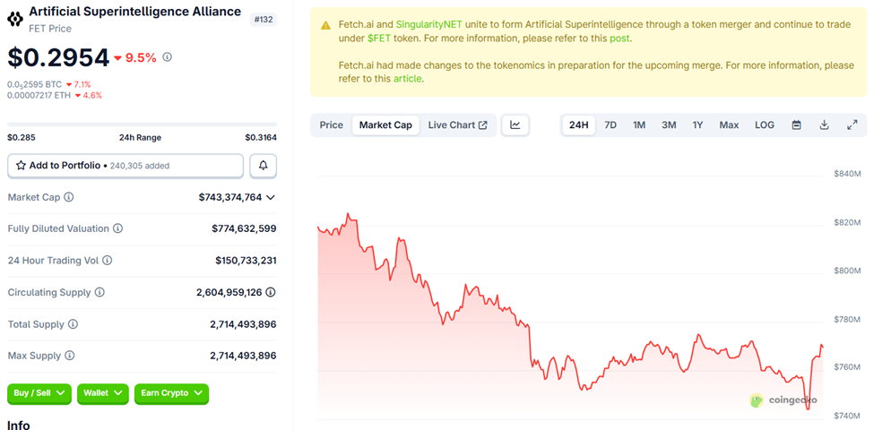 The statement comes as the FET price dropped almost 10% in 24 hours, trading at $0.2954 on CoinGecko at the time of writing.