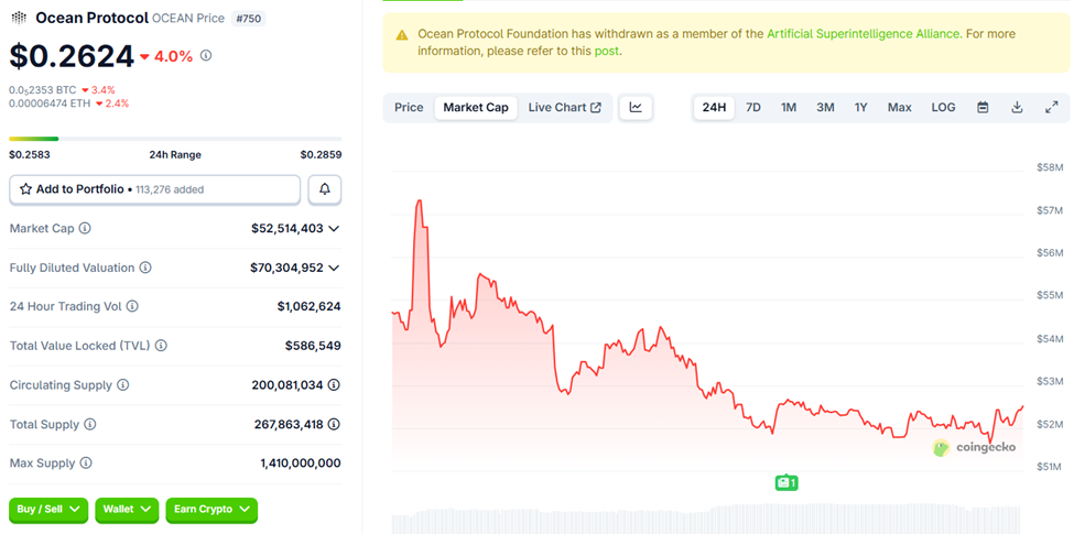 SponsoredSince the split, OCEAN’s price has plunged from a March 2024 peak above $1.00 to roughly $0.2625, while the foundation announced plans to buy back and burn OCEAN tokens using project profits. This measure is aimed at supporting long-term value.