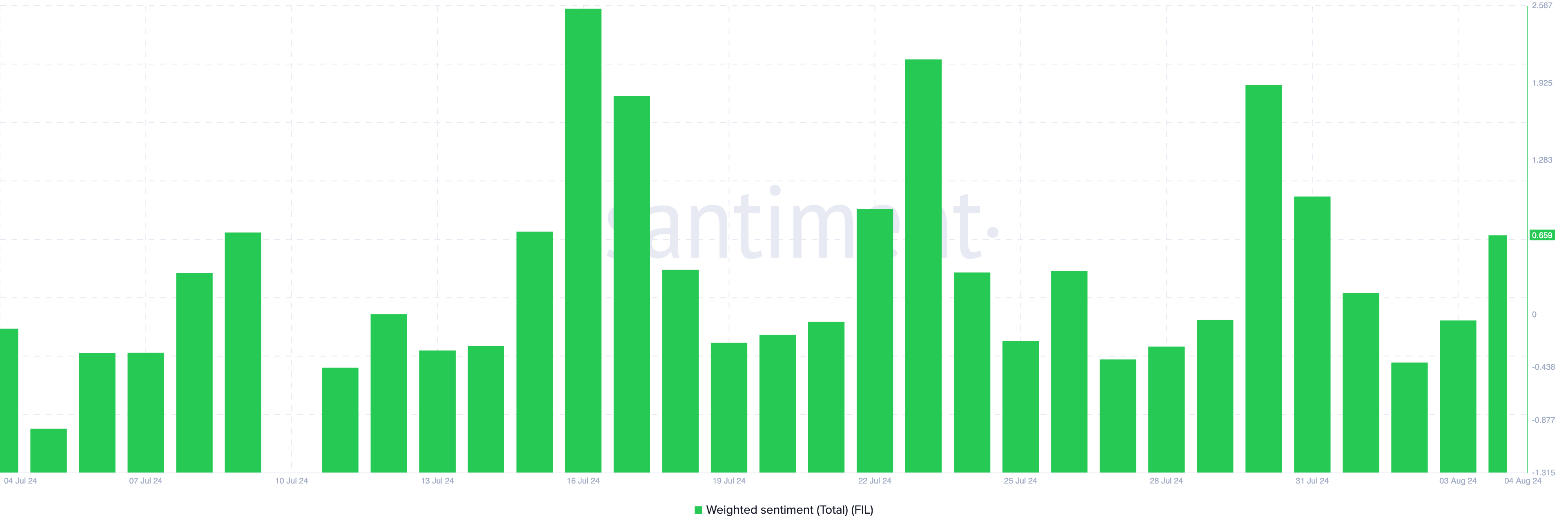 Meanwhile, the actions of these traders have not affected the perception the broader market has about FIL. According to Santiment, the Weighted Sentiment has risen into the positive region.