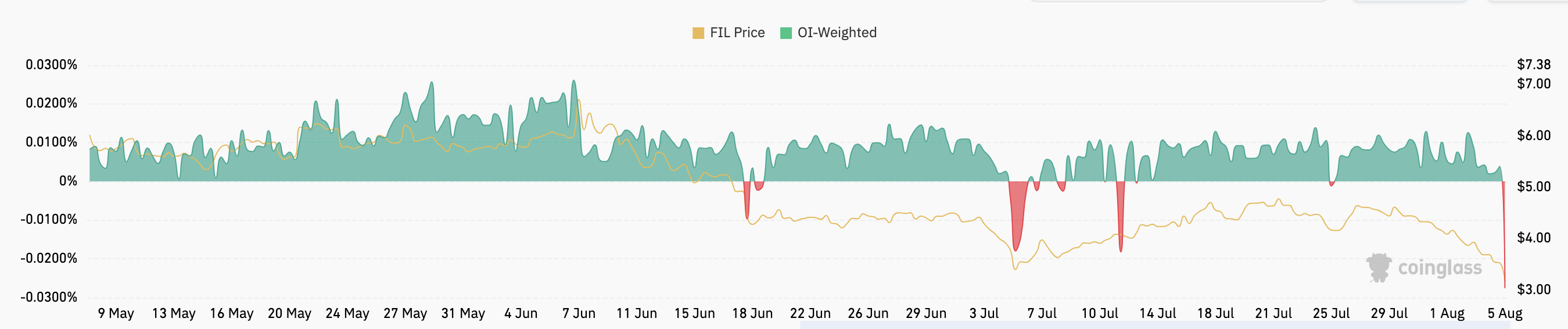 At press time, FIL trades at $3.03 — the lowest value the token has reached in more than ten months. Despite the notable downswing, Santiment shows that the Funding Rate has turned negative.