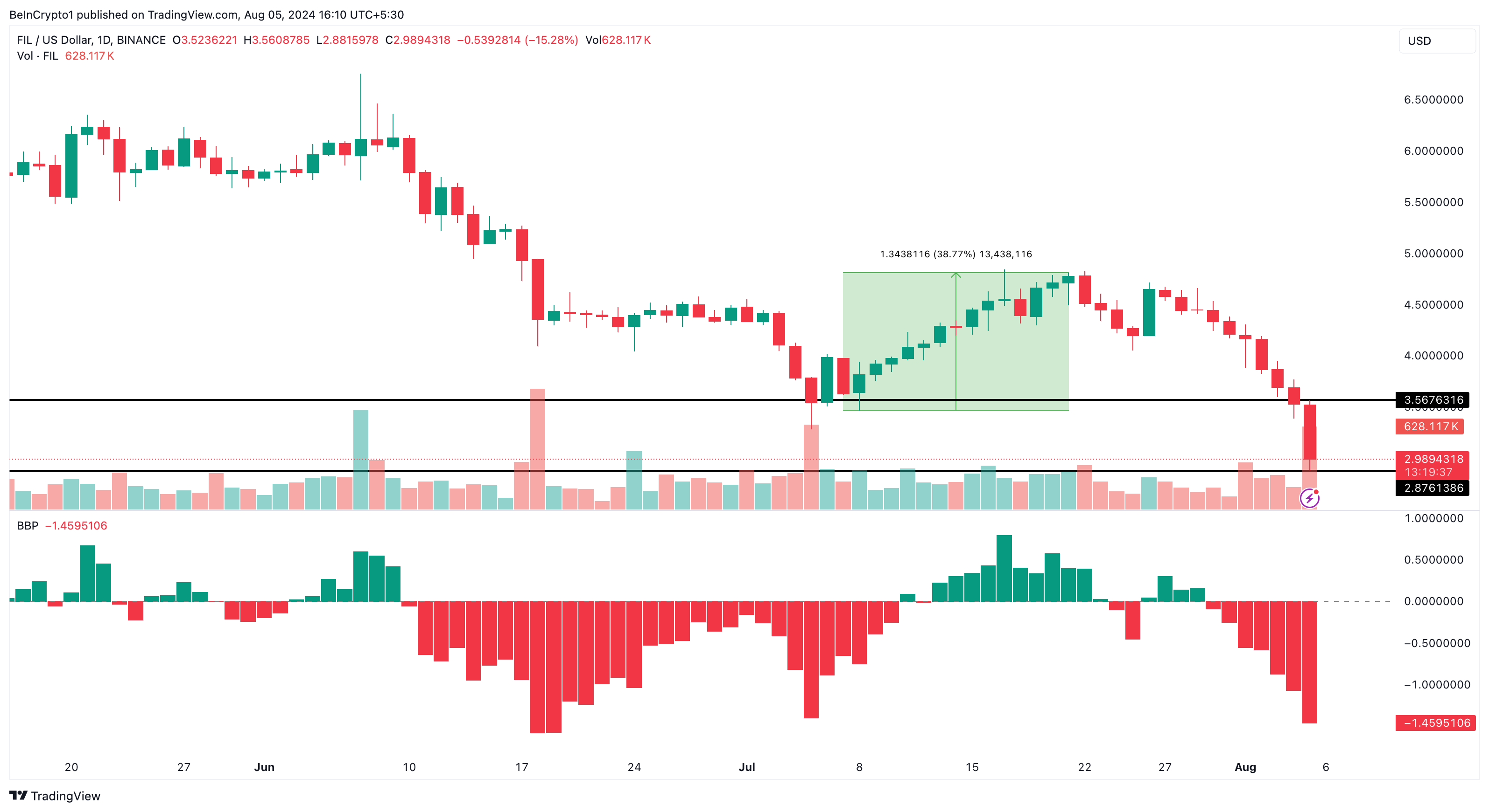 Bulls (buyers) are stronger when the BB rises in the positive region. However, at press time, the BBP is in the negative region, suggesting that bears are dominating. If this continues, FIL’s price risk drops below $3 and could decline to $2.87.