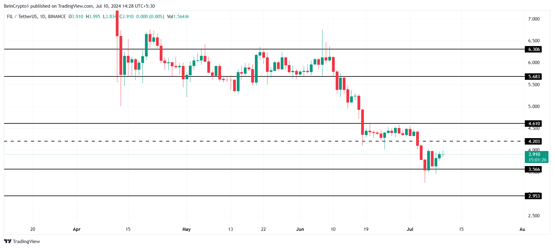 Filecoinâs price is trading at $3.9 at the time of writing, attempting to breach $4.2 and flip it into a support line. This line has acted as a serious support level for the altcoin, and it could also help FIL breach $4.6 and head towards $5.0.