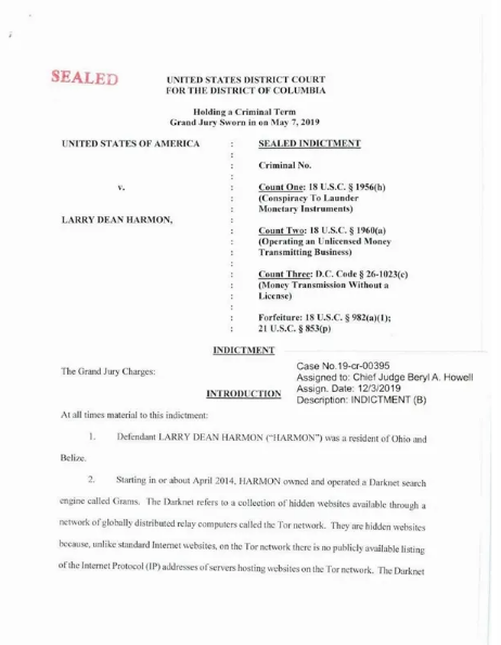 In May 2019, Harmon was indicted by the Attorney’s Office of the U.S. District Court for the District of Columbia on single counts of conspiracy to launder monetary instruments, operating an unlicensed money transmitting business, and money transmission without a license.