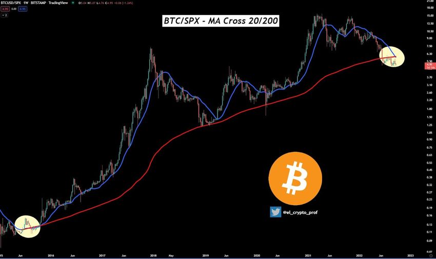 Cryptocurrency analyst @el_crypto_prof tweeted a chart of Bitcoin in which he also pointed out the death cross of the 200W MA. However, on his chart, the 20W MA crosses the 200W MA for the second time in history. This is because he drew moving averages for the ratio between the price of Bitcoin and the S&P 500 index.