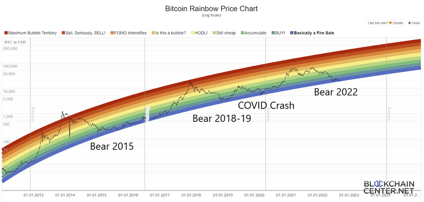 The narrative of reaching an absolute bottom near the 200W MA is supported by Bitcoin’s famous “rainbow chart.” It delineates the areas of logarithmic regression, color-coded according to the rainbow spectrum, best for buying, holding, or selling.