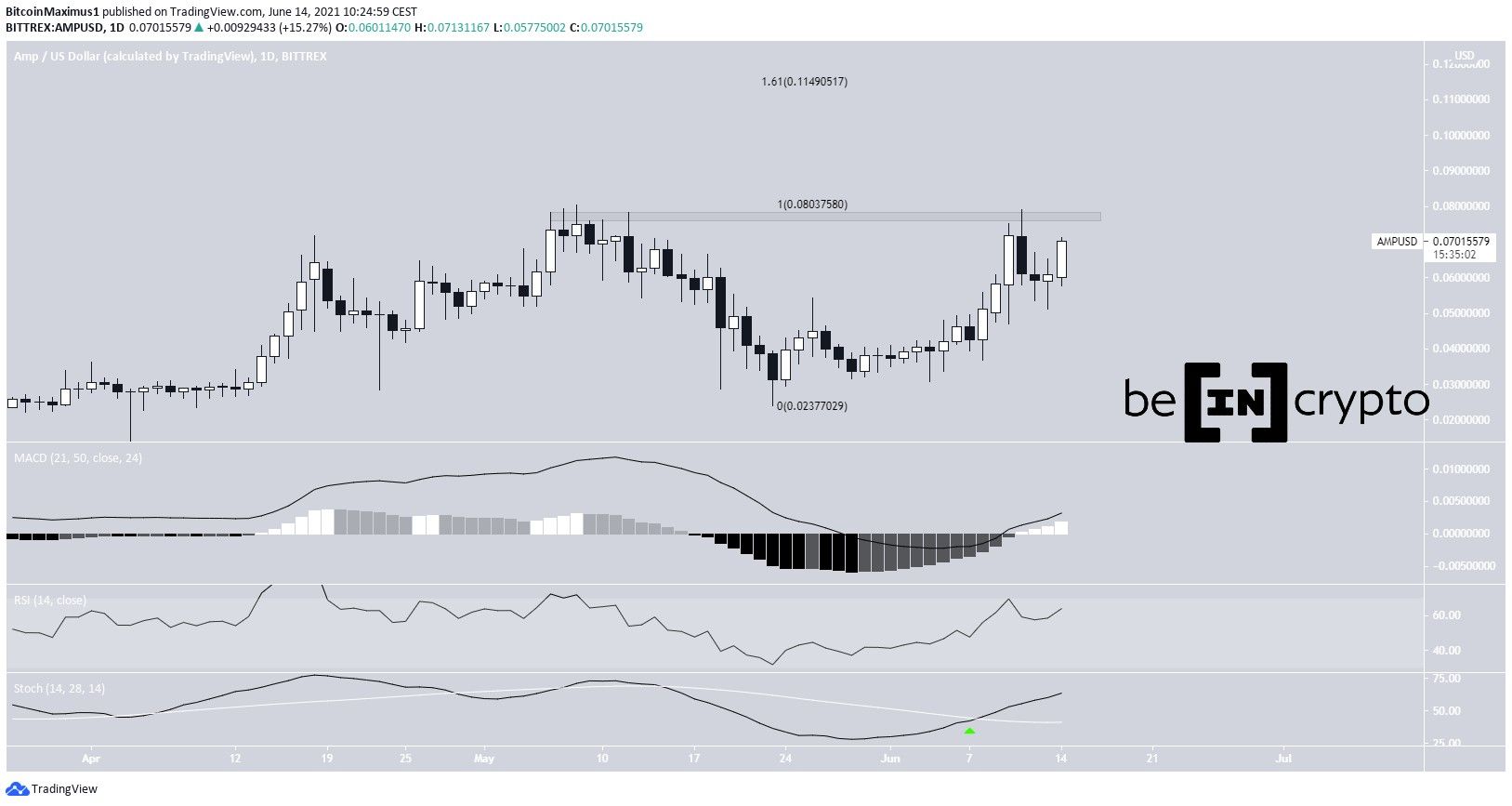 AMP has been moving upwards since May 23, when it reached a low of $0.023. The increase continued until a high of $0.079 was reached on June 11, barely failing to reach a new all-time high price.