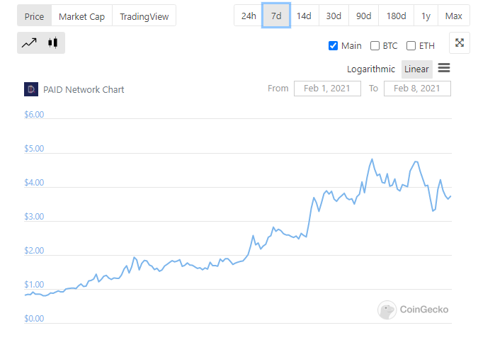Finally, this week’s top gainer was PAID. The network’s resident token saw a 455.9% gain after initially launching on Jan 26. The token, which can currently only be traded on a Decentralized Exchange (DEX) like Uniswap, climbed to a height of $4.82 on Feb 7., after being released at just $0.84.