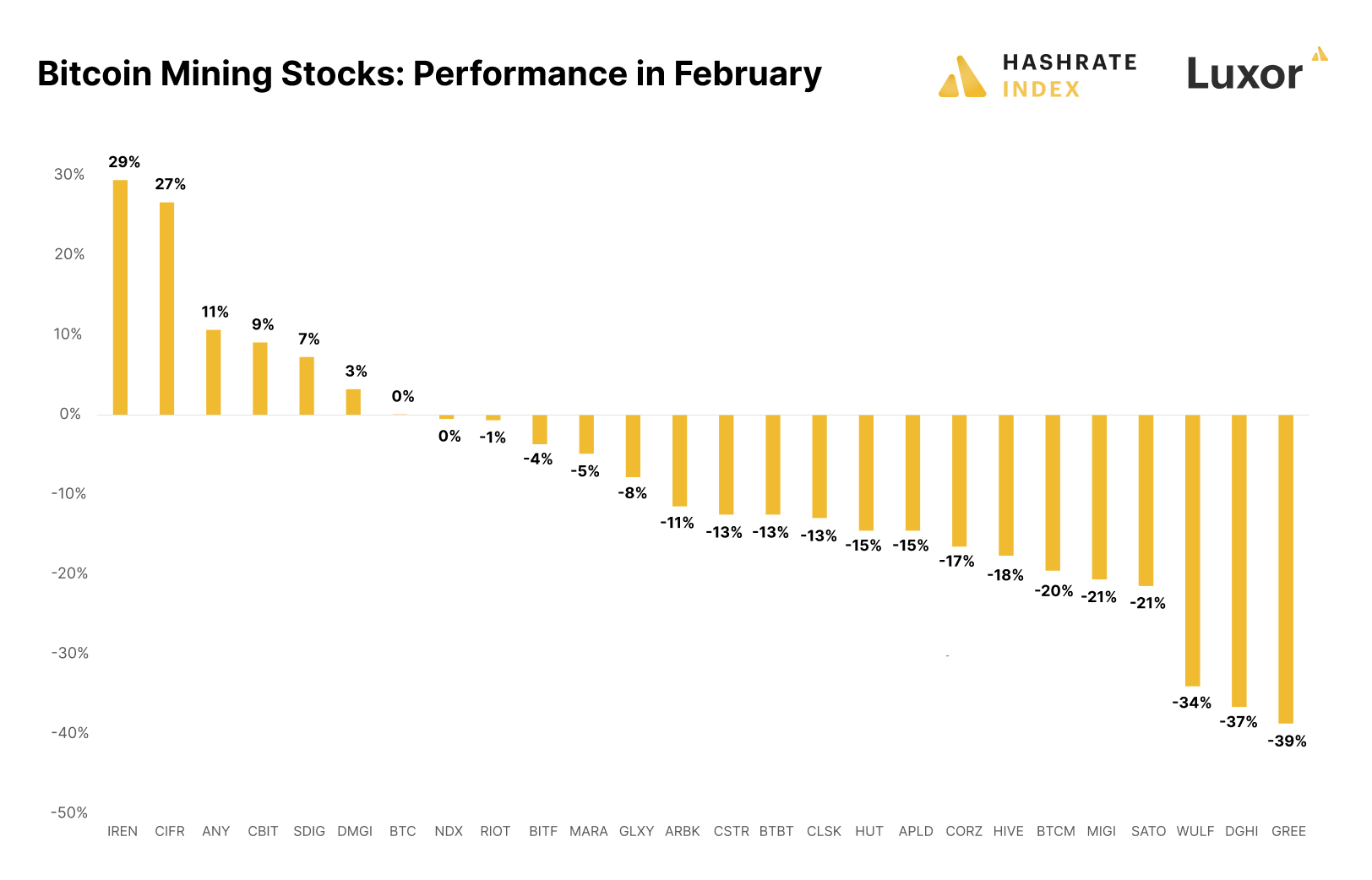 Iris Energy (IREN) was the top-performing mining stock in February, with a gain of 29%. The research found that most of the gains came mid-month when the Australian firm announced the purchase of 4.4 EH/s worth of mining rigs from Bitmain.