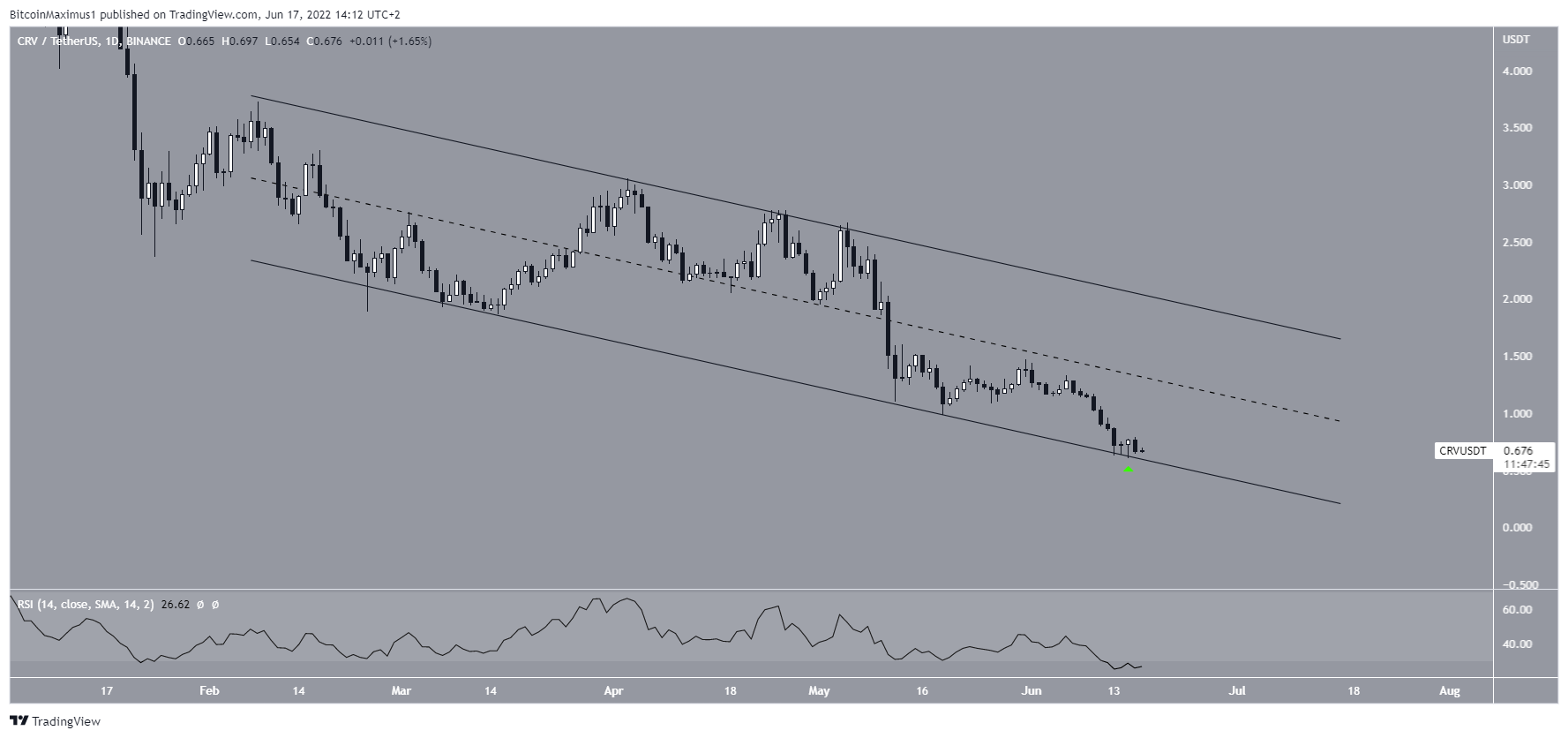Similarly to FLOW, CRV is trading inside a descending parallel channel. It has been doing so since the beginning of Feb.Â