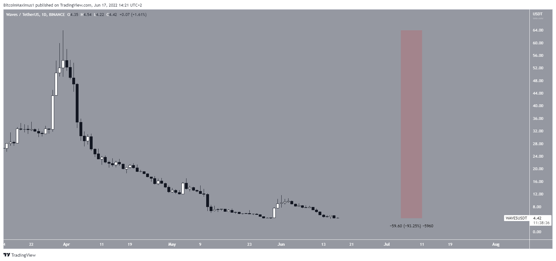 WAVES has been falling since reaching an all-time high price of $69.88 on March 31. The decrease has been swift, with the price having decreased by 93% so far.Â