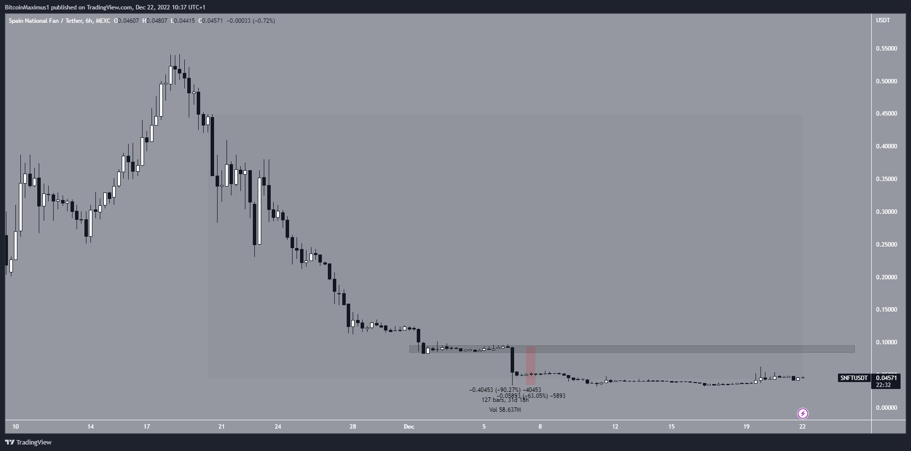 The SNFT has fallen by 90% since the start of the FIFA World Cup. Similar to the Brazil fan token, SNFT fell by 62% after their shock elimination to Morocco on Dec. 6 (red icon). It reached an all-time low of $0.033 the same day.