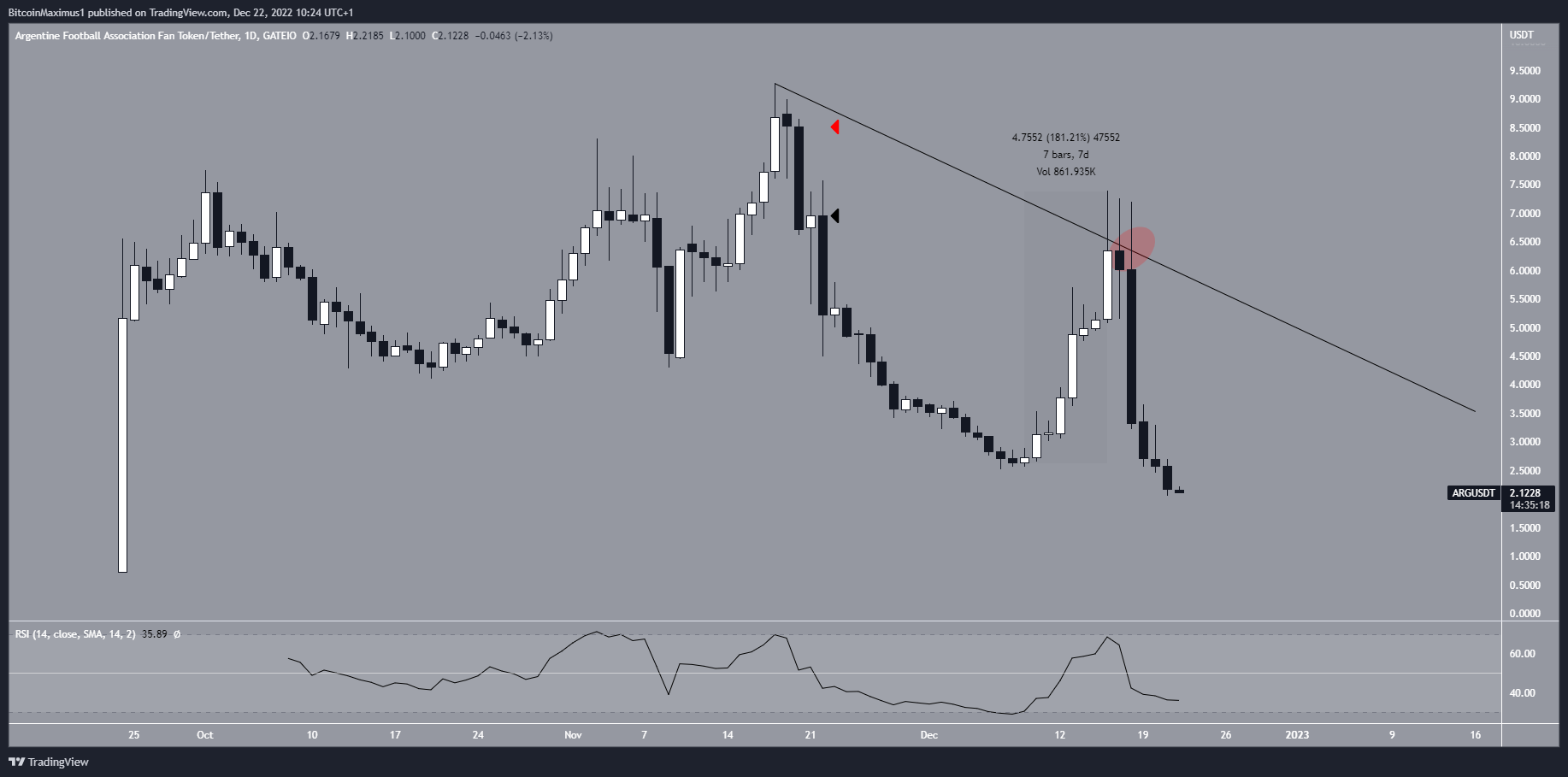 However, even though Argentina and Lionel Messi were crowned world champions on Dec. 18, the ARG fan token price crashed shortly afterward, validating the slop of the resistance line (red circle). This likely occurred as fan token holders cashed out, and also caused the daily RSI to fall below 50, a sign of a bearish trend.