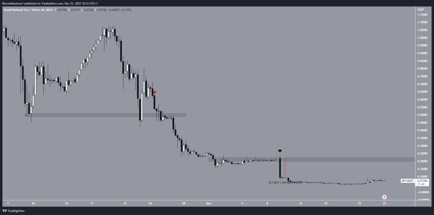 The Brazil Fan Token also fell sharply during the World Cup. Interestingly, the BFT price fell even after the team posted successful results, as was the case after the Nov. 24 win against Serbia (red icon).