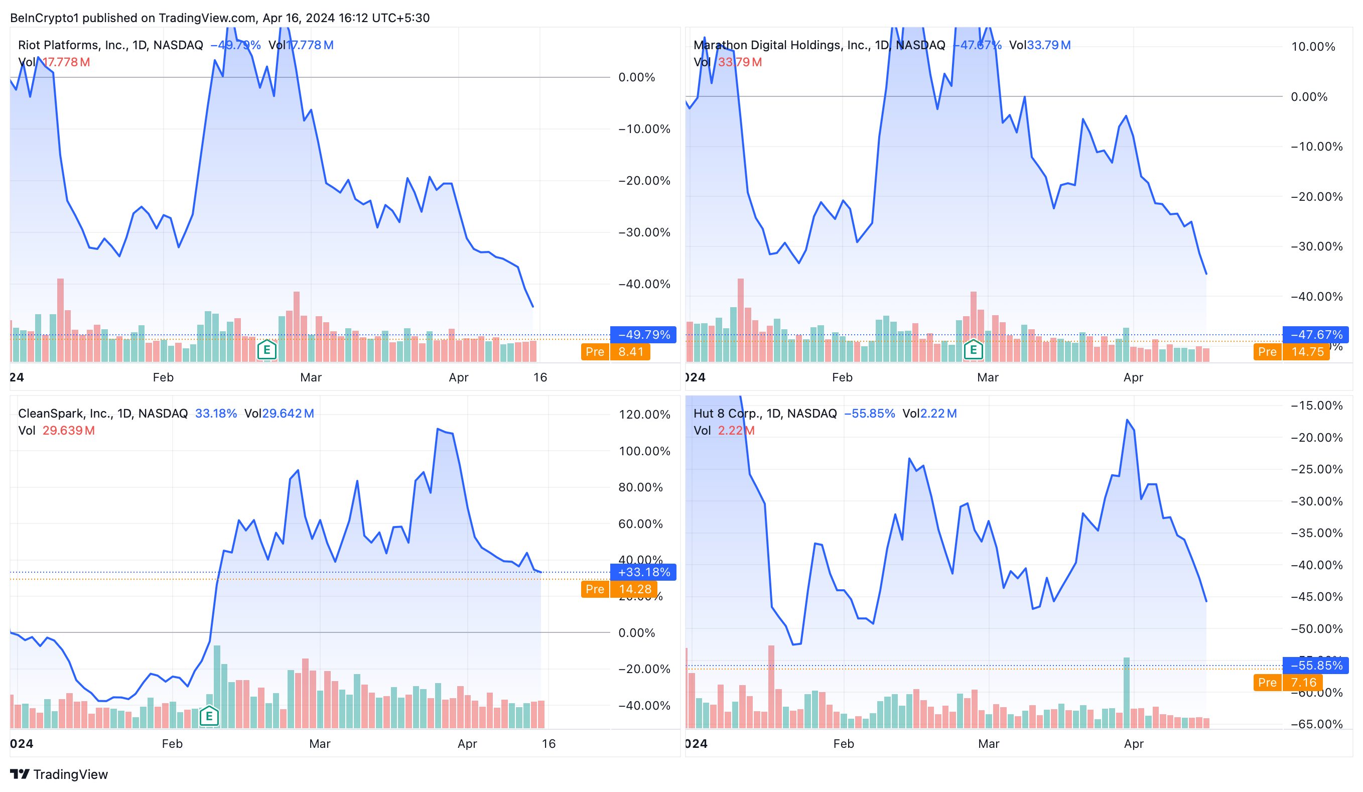 This year, Bitcoin miners like Riot Platforms (RIOT), Marathon Digital Holdings (MARA), and Hut 8 Corp (HUT) have seen significant declines in their stock values. Year-to-date, the prices of these stocks have fallen by at least 47%.