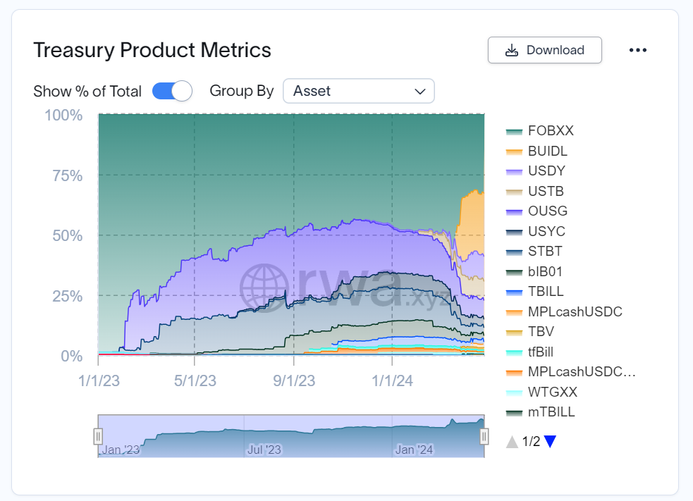 BUIDL and Ondo US Dollar Yield have market capitalizations of $304.61 million and $119.69, respectively.