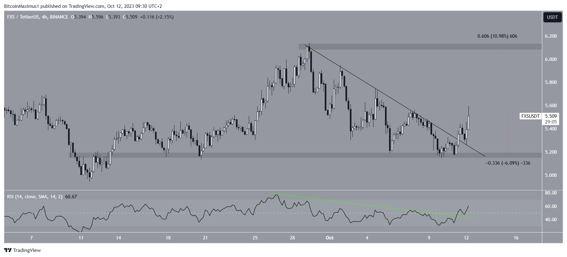 If the upward movement continues, the FXS price can increase by another 11% and reach the $6.10 horizontal resistance area.