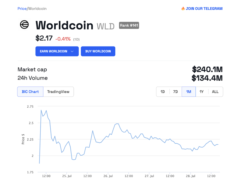 As of this writing, WLD is trading at $2.17, down by roughly 0.41% in the past 24 hours. However, according to data from TradingView, the token is down by roughly 35% from its all-time high of $3.30.