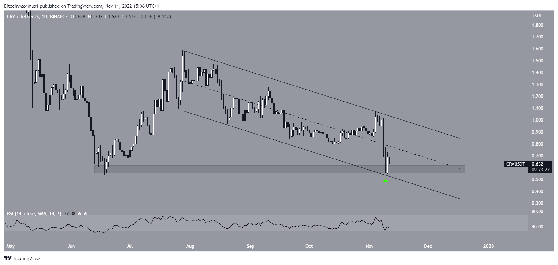 CRV has been decreasing inside a descending parallel channel since July 28. The downward movement led to a low of $0.52 on Nov. 9. The low served to validate the $0.42 horizontal support area and the support lien of the channel.