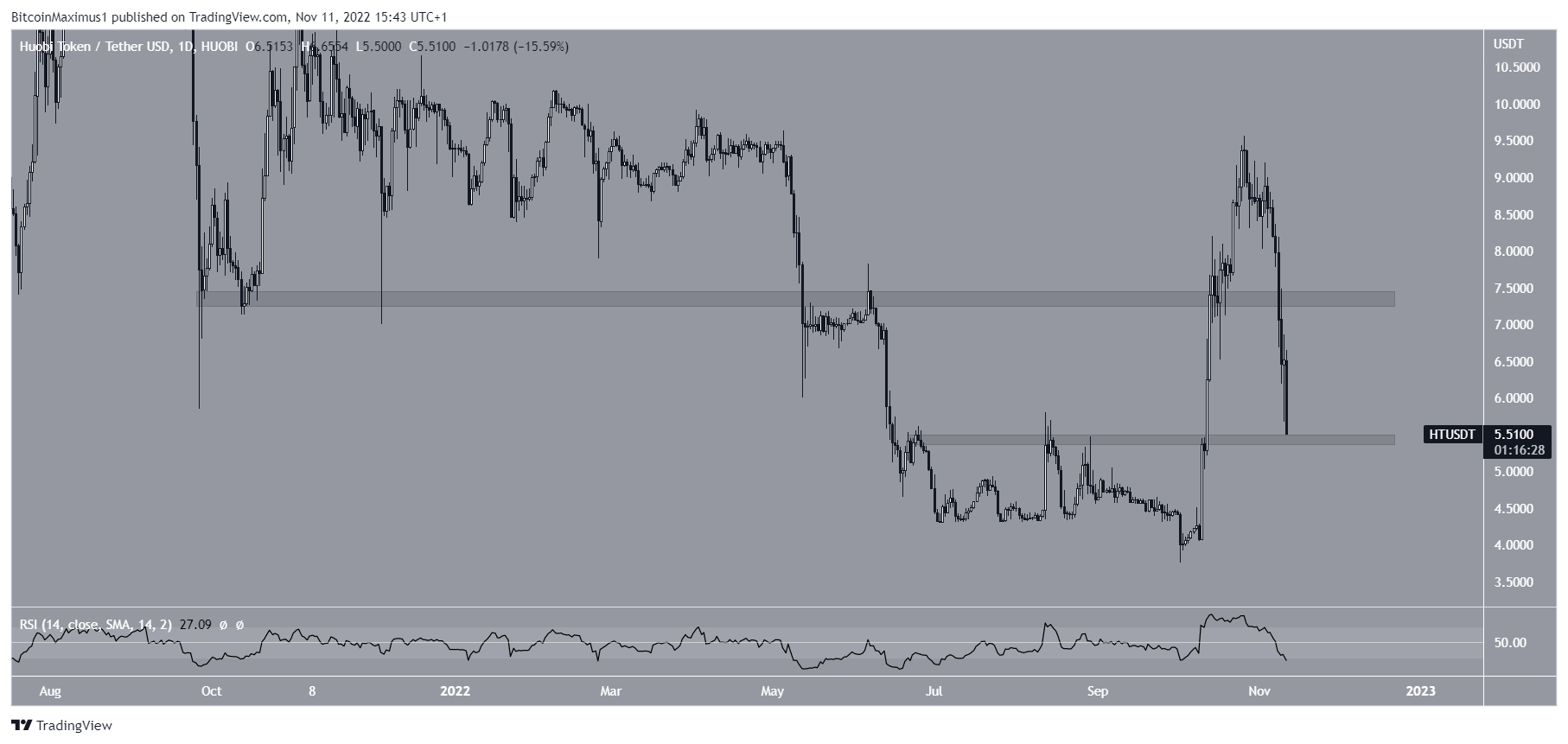 HT has been decreasing since reaching a high of $9.57 on Oct. 26. The downward movement led to a low of $5.50 on Nov. 11. Furthermore, it caused a breakdown below the $7.40 area, which is now expected to act as resistance.