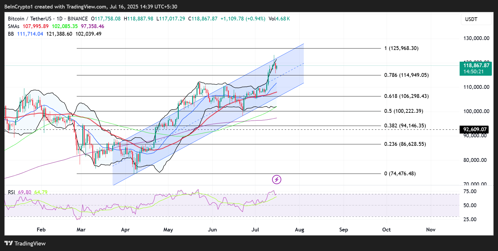 According to the BTC/USDT trading pair on the on-day timeframe, Bitcoin price may be due for a correction before the next upside. This comes after the price breached the upper boundary of the Bollinger indicator at $121,388, indicating an overbought market.