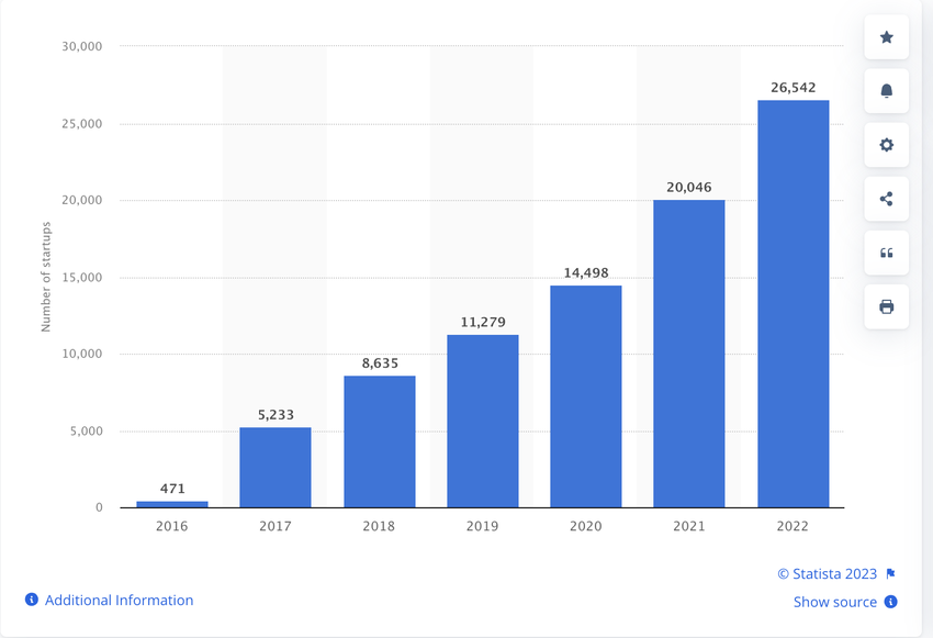 The screenshot below shows that the number of government-recognized startups in India increased from 471 in 2016 to 26,542 in 2022.