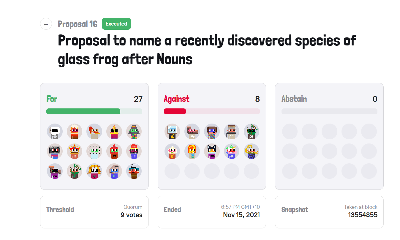 Says Noun 53, “The Nouns DAO members recognize the importance of biodiversity and protecting it. Naming this frog is just one of the many ways we have demonstrated our collective commitment and passion for nature and its conservation.”
