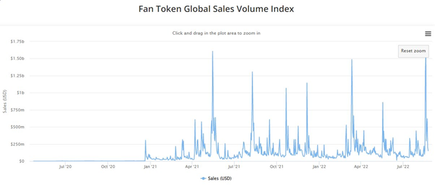 Compared to global NFT sales from mainstream collections such as Axie Infinity, Bored Ape Yacht Club (BAYC), CryptoPunks, Mutant Ape Yacht Club (MAYC), NBA Top Shots, Otherdeeds, and Azuki among others, Global Fan Tokens have generated $50 billion more in sales volume.Â