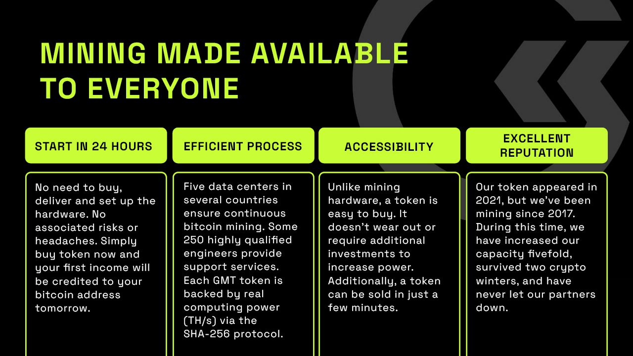 GMT is easing the entry into bitcoin mining with its token. The GMT token is a bitcoin mining token backed by computing power. The holders of GMT tokens can immediately begin BTC mining after 24 hours of the token purchase. Holders don’t need to worry about buying equipment and configuring the infrastructure.