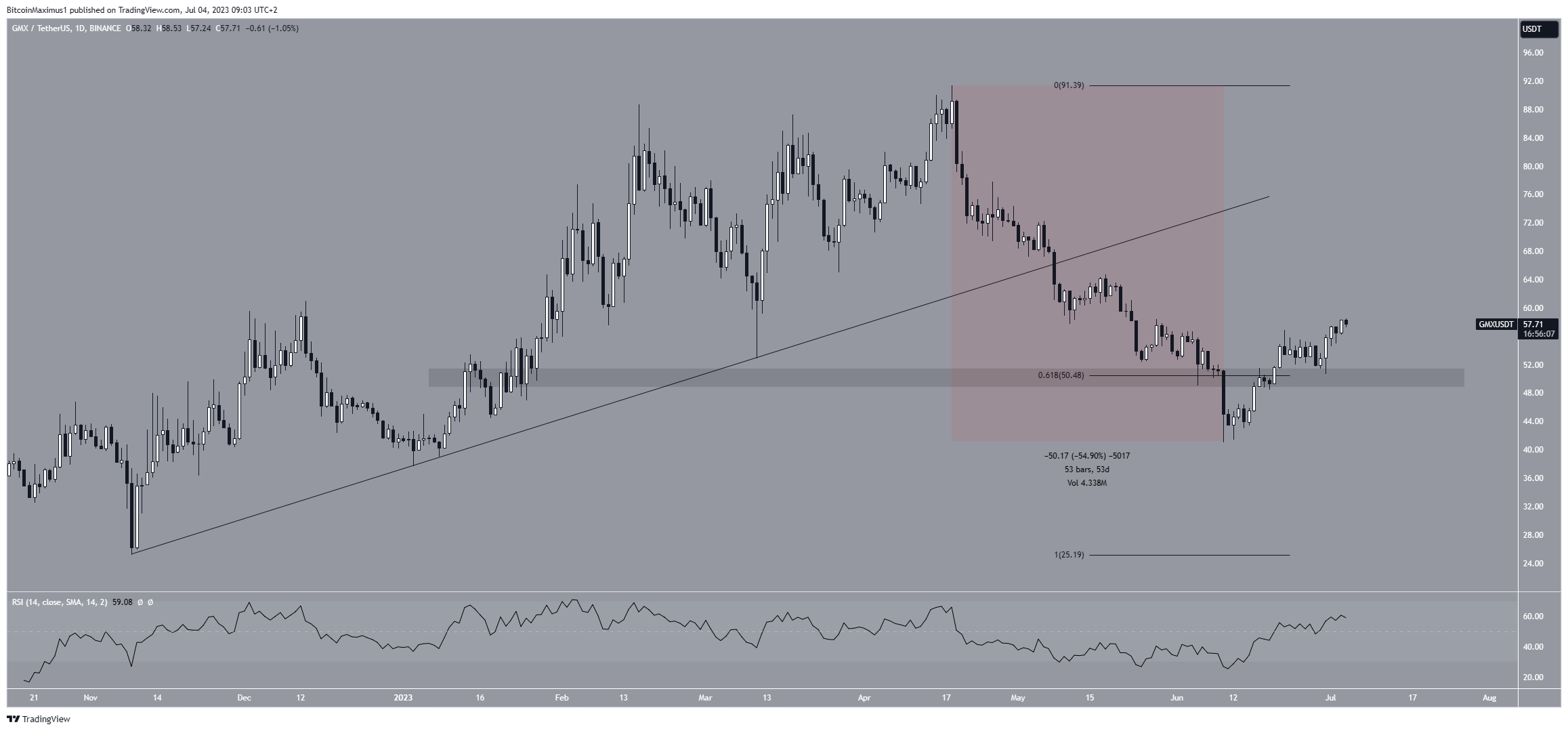 The GMX price began a downward movement on April 18. In a span of 53 days, it fell by 55%, culminating in a low of $41 on June 10. At the time, it seemed that GMX had broken down from a confluence of support levels at $50.50, created by a horizontal support area and the 0.618 Fib retracement support level.