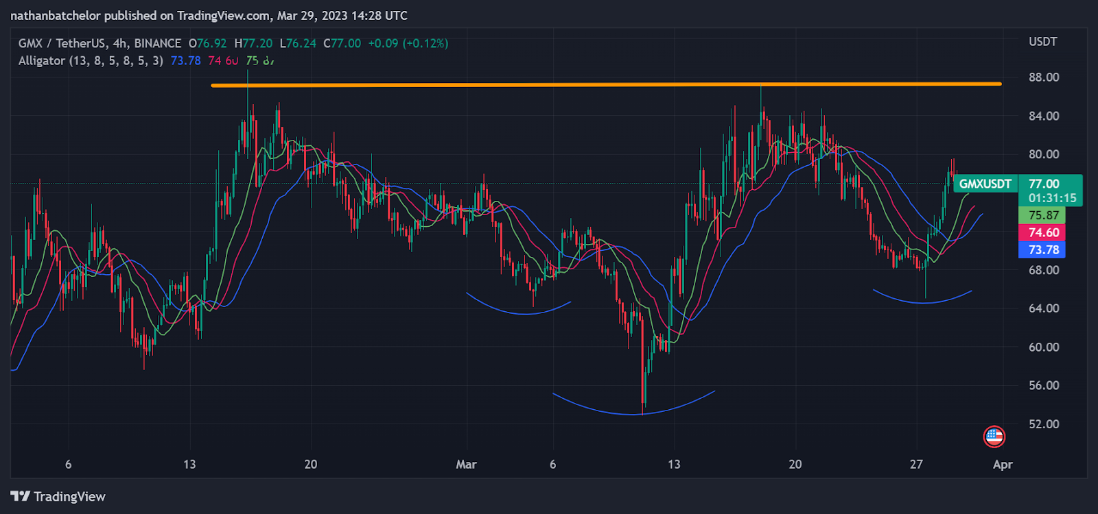 GMX is trading back towards the best of the year, following a short-lived panic in the broader cryptocurrency market due to the lawsuit against Binance and its CEO Changpeng Zhao by the CFTC.