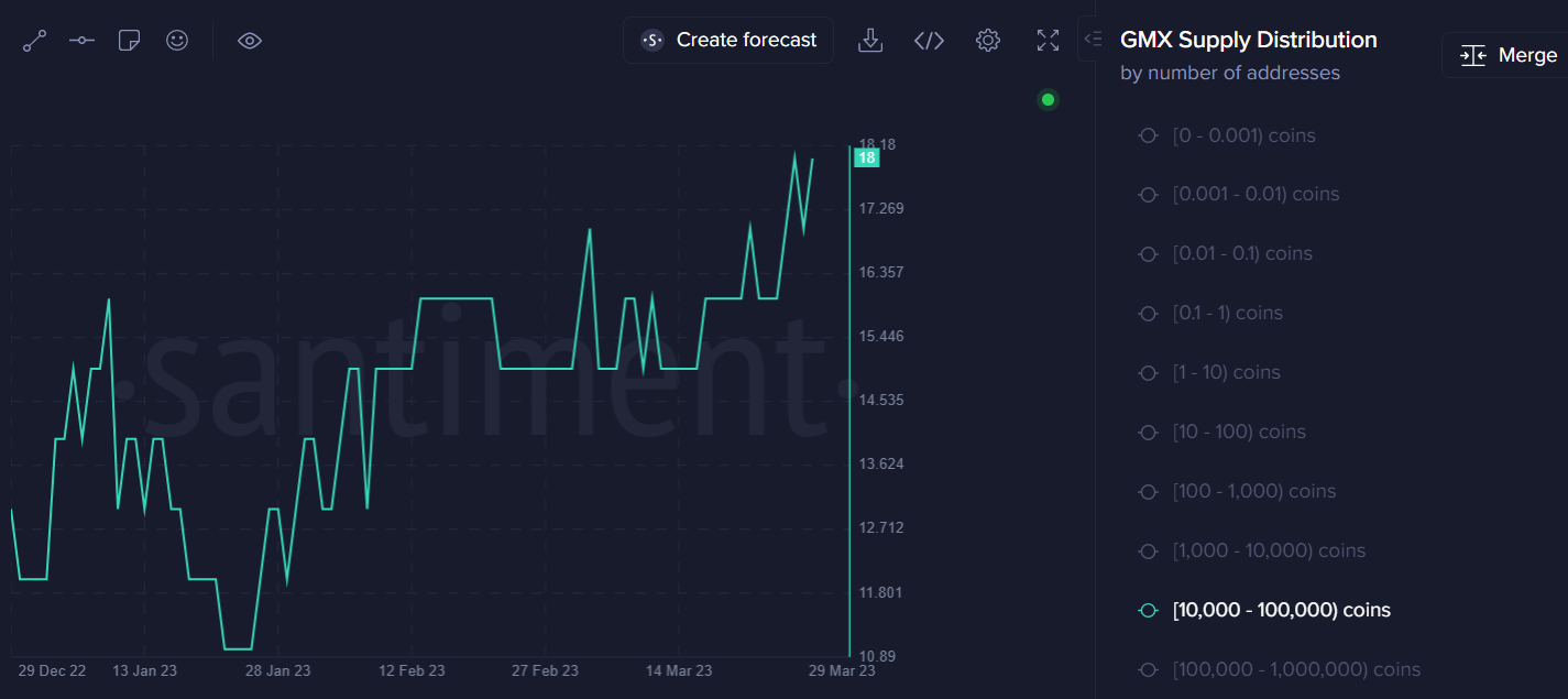 GMX supply distribution chart shows that the whales with 10,000 to 100,000 coins now hold around 6.40% of the supply. This is up from just over 3.49% at the start of 2023.
