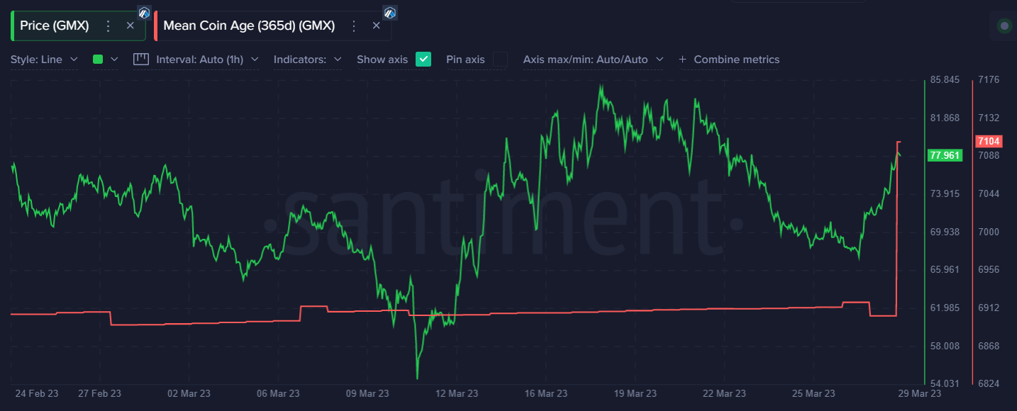 On-chain metrics currently depict a network-wide accumulation trend, as the Mean Coin Age (360d) indicates. Blockchain forensics platform Santiment describes this indicator as the average number of days each GMX token has stayed in its current address.