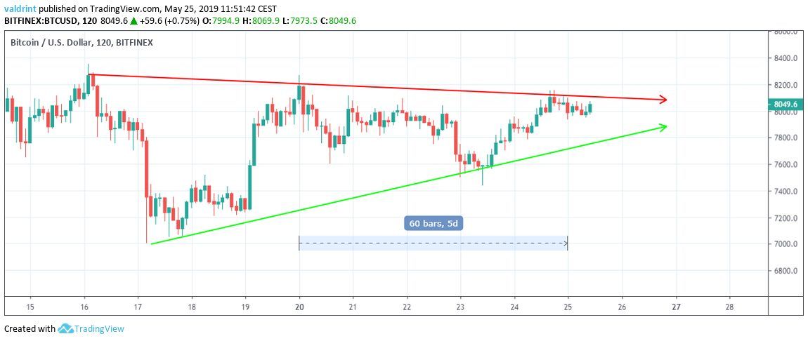 The price of BTC/USD is analyzed at two-hour intervals from May 15 to May 25.