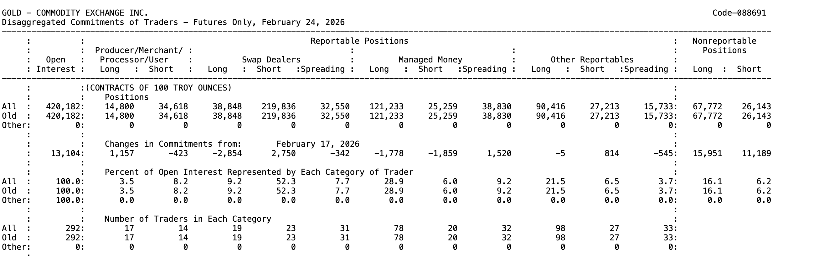 Rising open interest alongside a stable price (flat week-on-week) indicates conviction. Compare this to silver, where managed money holds just 8,500 net long contracts and open interest is declining.