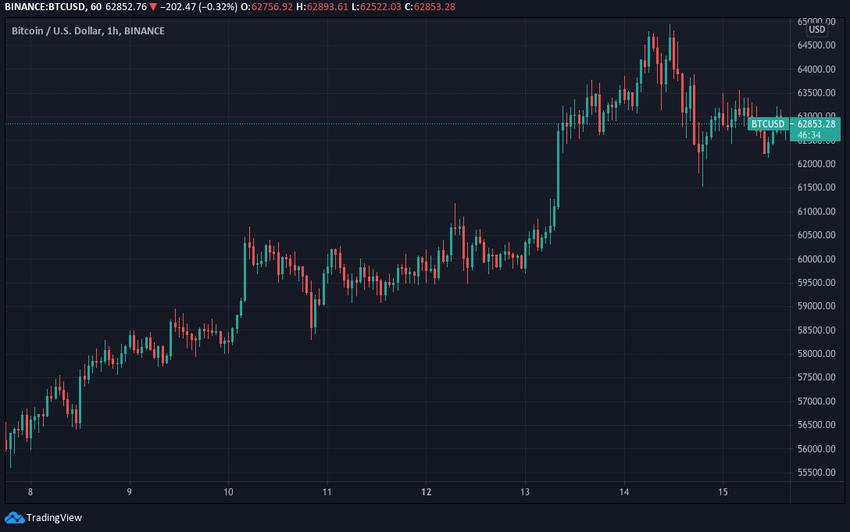 The next day it achieved a new all-time high just below $65,000. Selling pressure has brought it back down to around $63,000.