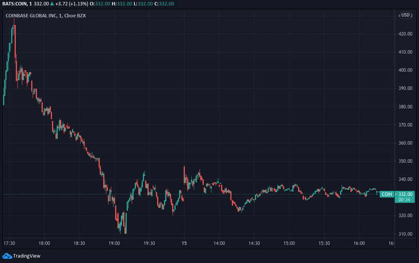Shares of crypto exchange Coinbase were listed on the Nasdaq yesterday. The chart below features one-minute candles. We see that for the first few minutes eager buyers pushed COIN’S price to a high of $428.94.
