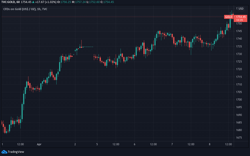 Meanwhile, April 6 began with buying pressure that largely continued into the afternoon, rising to $1,745. Gold floated down to $1,735 by the end of April 7. But buying pressure early in the day pushed gold’s price up to $1,755, where it is currently trading.